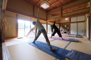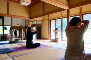 難しいポーズなどは行わず、からだをほぐすための簡単なストレッチとメディテーションのクラスです。ヨガが初めての方でも参加していただけます。お天気が良ければ敷地内のウッドデッキでヨガを行うこともできます。