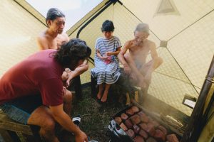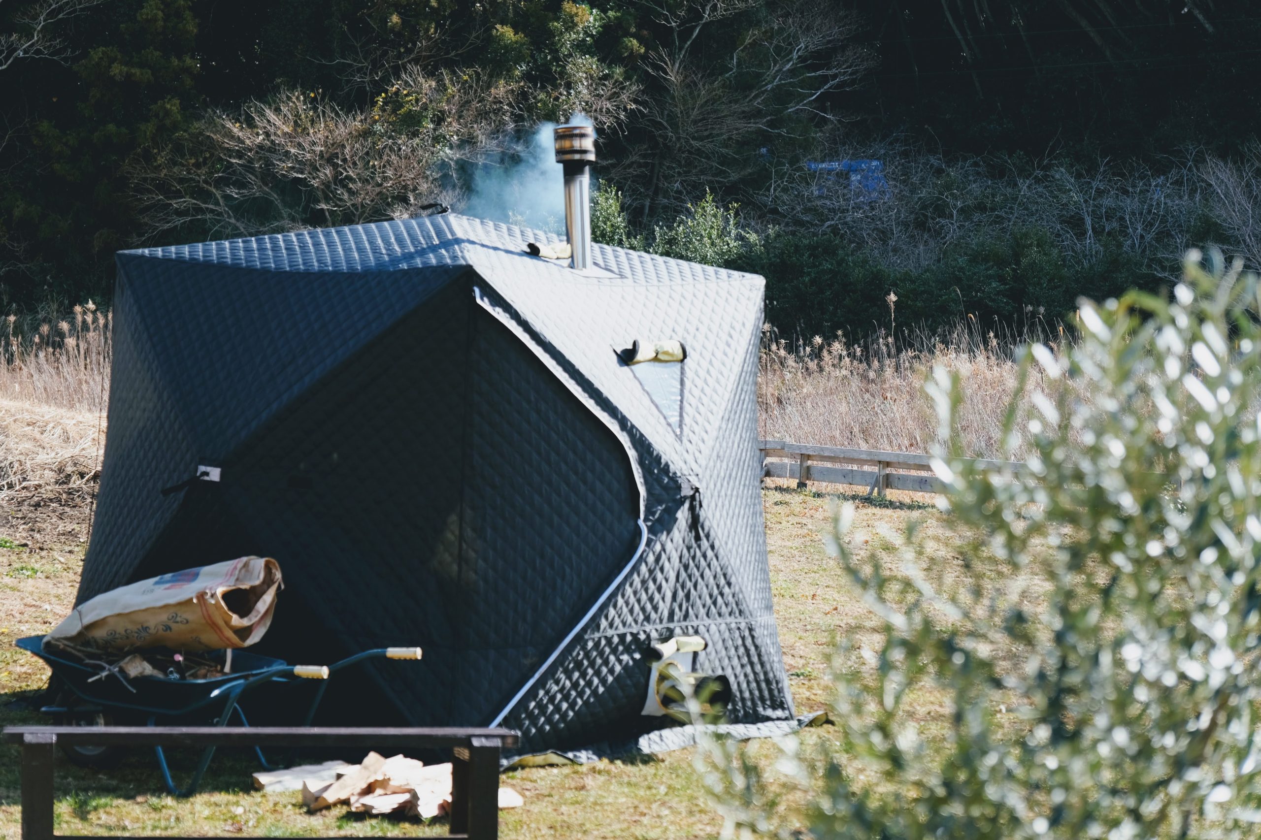 テントサウナがご利用いただけます。薪ストーブで熱したサウナストーンに水をかけて水蒸気を発生させることを「ロウリュ」と言います。セルフロウリュで発汗を促し、ハーブを煮出した水を使用し、ハーブの香りや薬草効果でさらにリラックス、デトックスが促されます。サウナ浴のあとは、自然の中での外気浴。鳥のさえずりや風、静かな里山で自然との一体感、開放感に包まれてください。